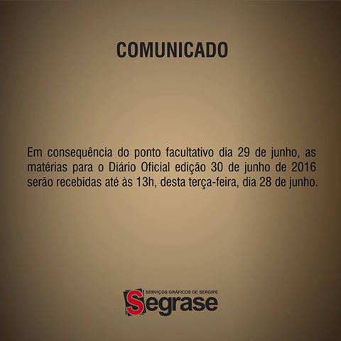 Em consequência do ponto facultativo dia 29 de junho, as matérias para o Diário Oficial edição 30 de junho de 2016 serão recebidas até às 13h, desta quinta-feira, dia 28 de junho.