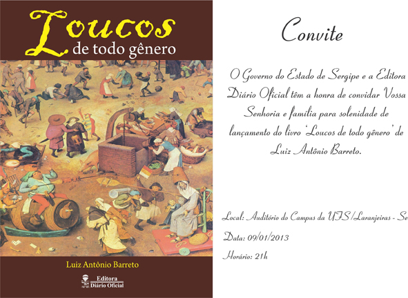 O Governo de Sergipe, através da Editora Diário Oficial, lança nesta quarta-feira, 9 de janeiro, o livro Loucos de todo gênero, escrito pelo jornalista e historiador Luiz Antônio Barreto, falecido em abril do ano passado.O lançamento do livro será às 21h, no auditório do Campus da Universidade Federal de Sergipe, em Laranjeiras-SE, durante a rea...